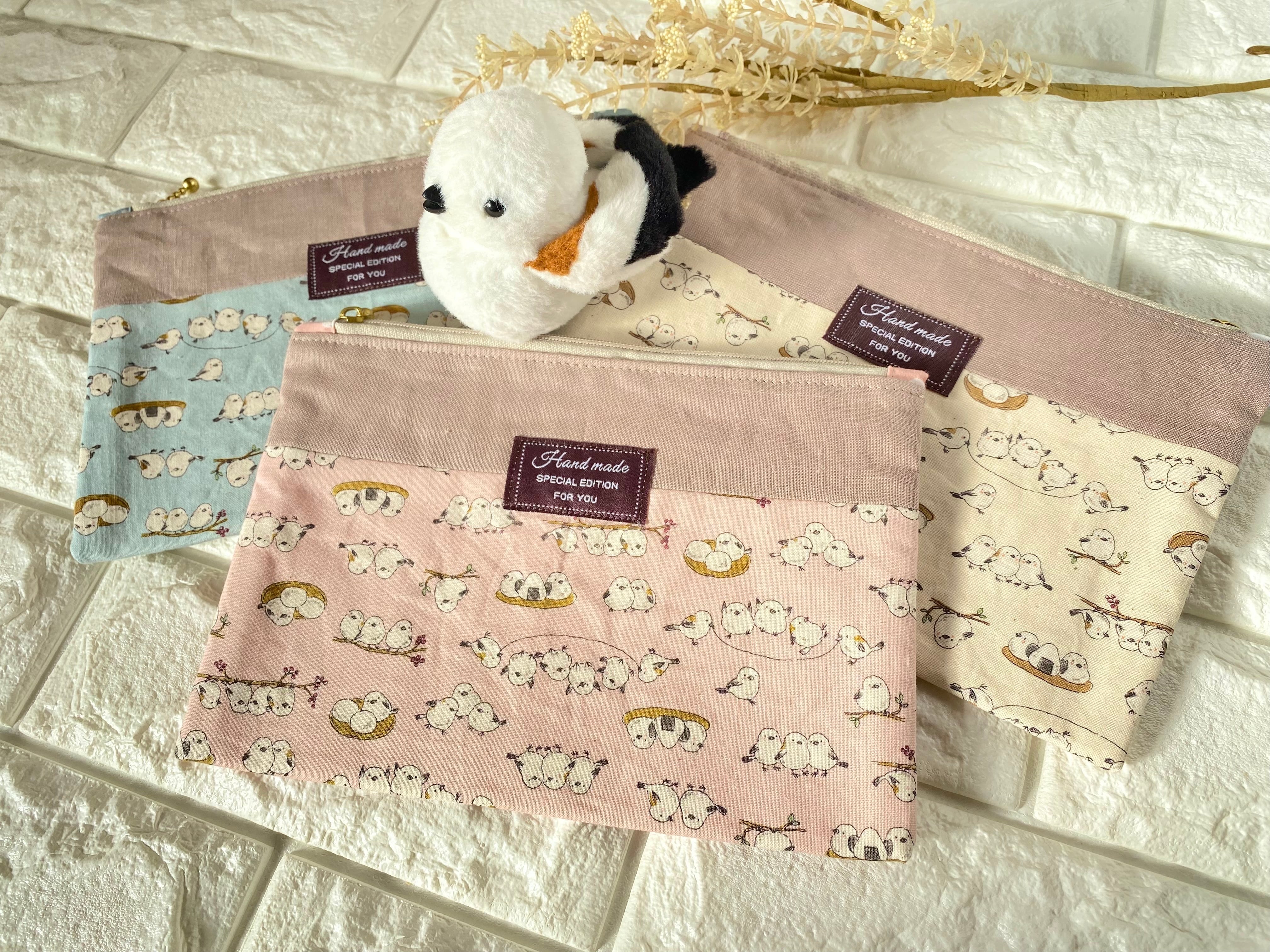 シマエナガのフラットポーチ|淡いピンク(ハンドメイド)