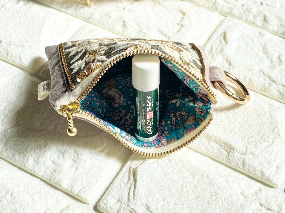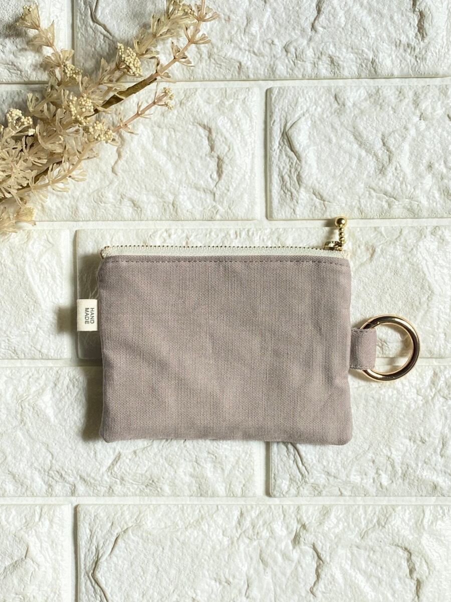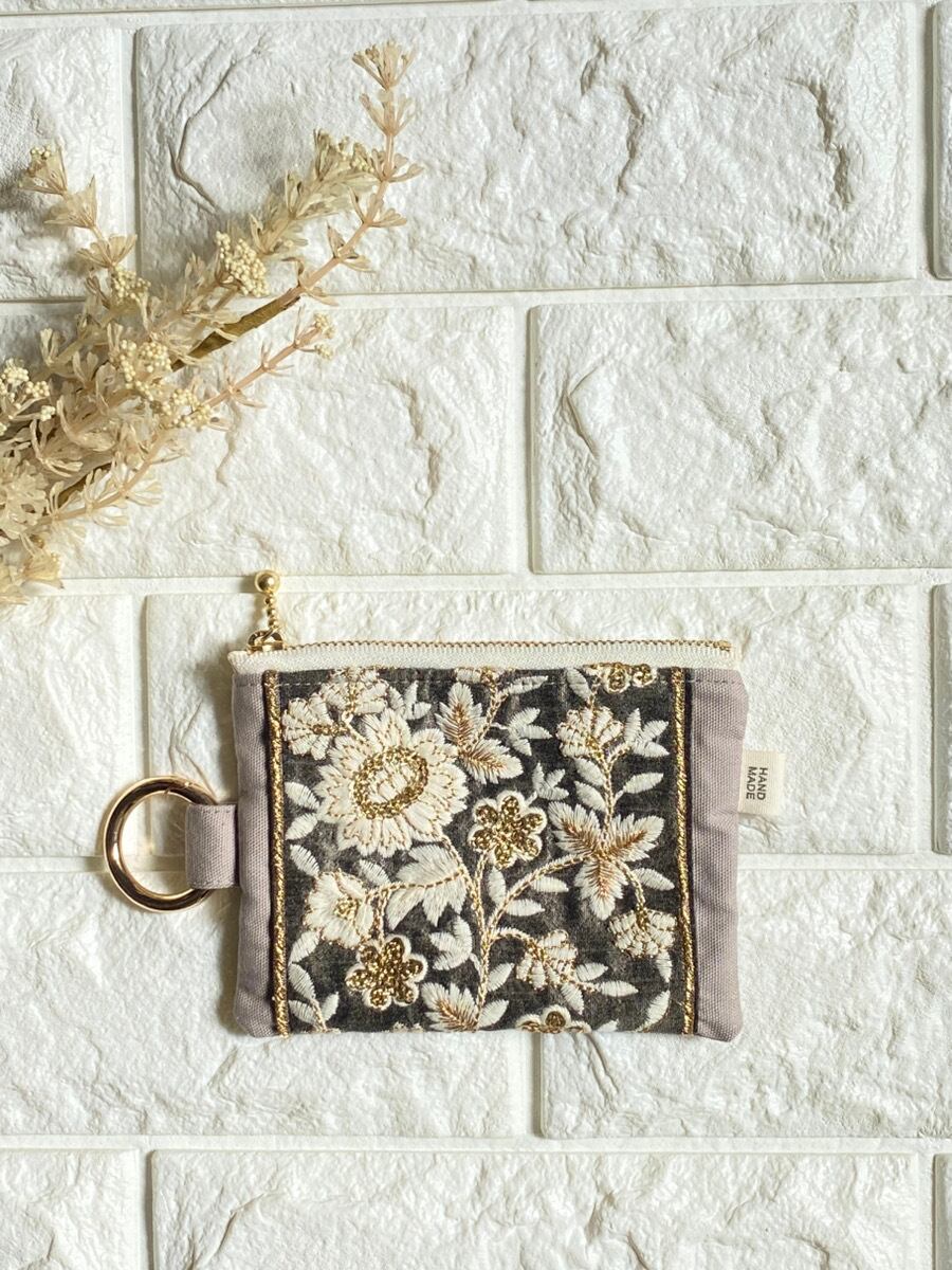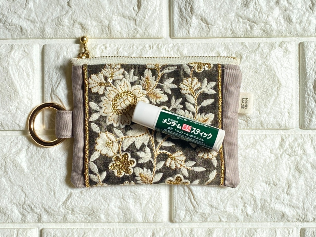 インド刺繍リボン ミニポーチ|カラビナ付き|キーケース・イヤホンケース・小銭入れ|チャコールグレー × ベージュ