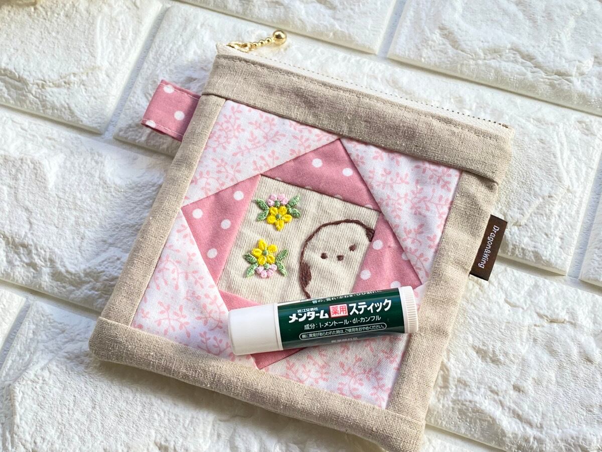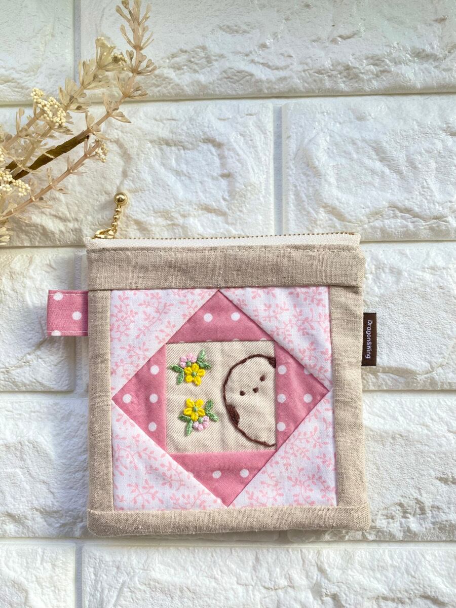 シマエナガの手刺繍パッチワークポーチ|ピンクのスクエアポーチ