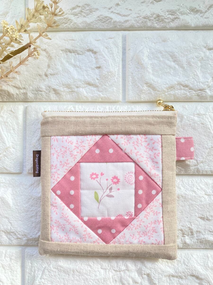 周囲にはピンク系のコットン生地を組み合わせたパッチワークを施し、やさしく温かみのある雰囲気のデザインになっています。