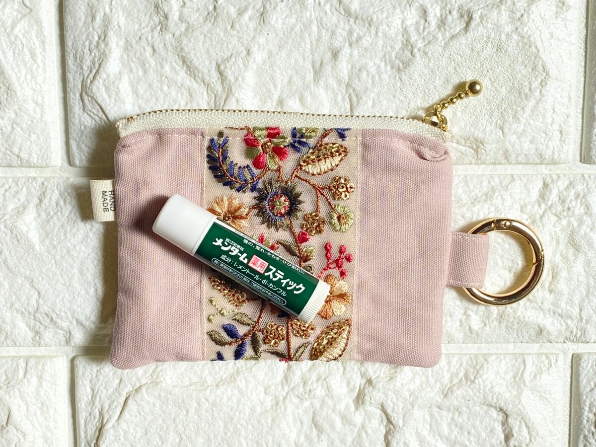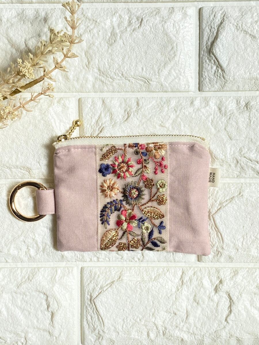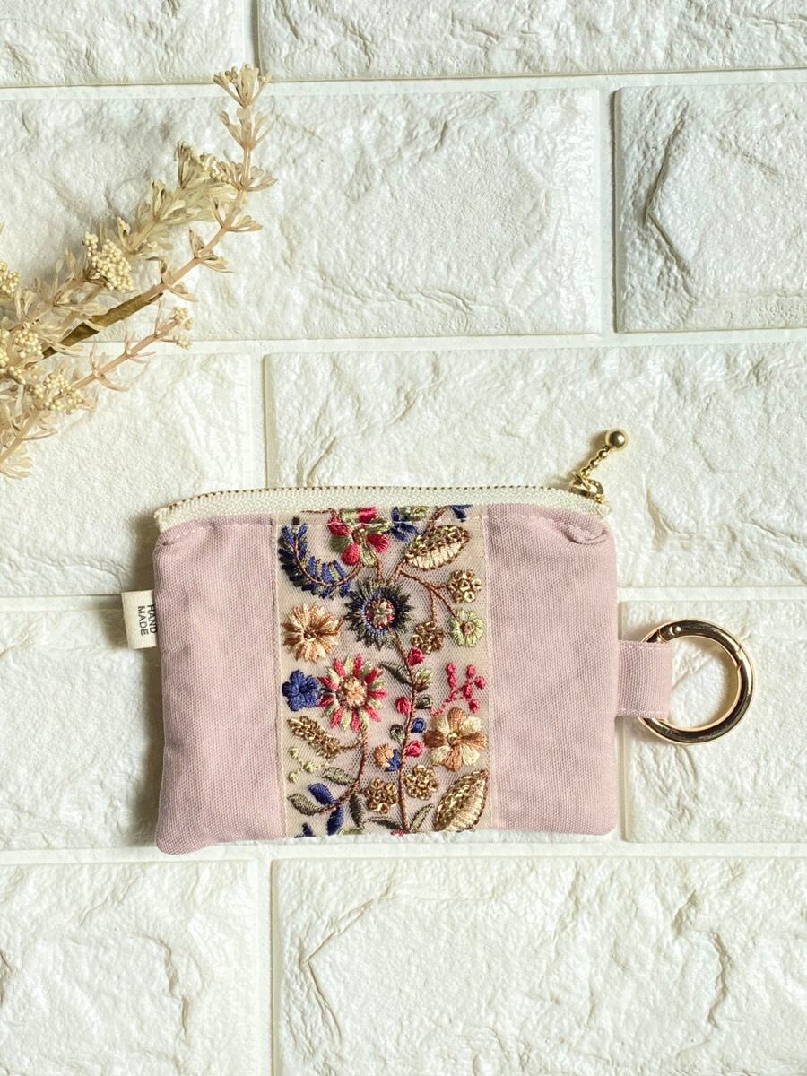 インド刺繍リボン ミニポーチ|カラビナ付き|キーケース・イヤホンケース・小銭入れ|くすみピンク