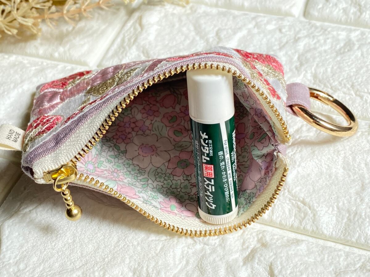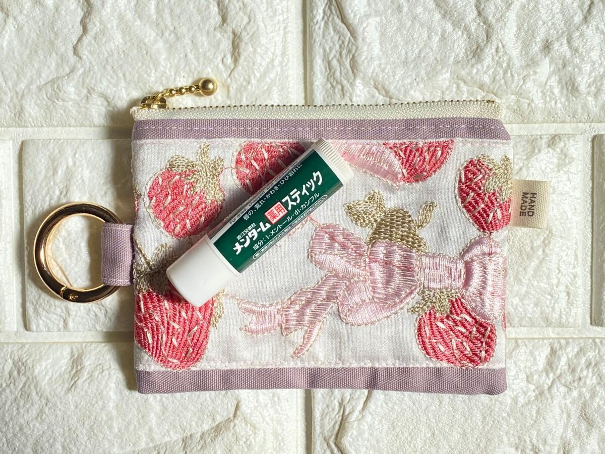 インド刺繍リボン ミニポーチ|カラビナ付き|キーケース・イヤホンケース・小銭入れ|くすみピンク×いちご