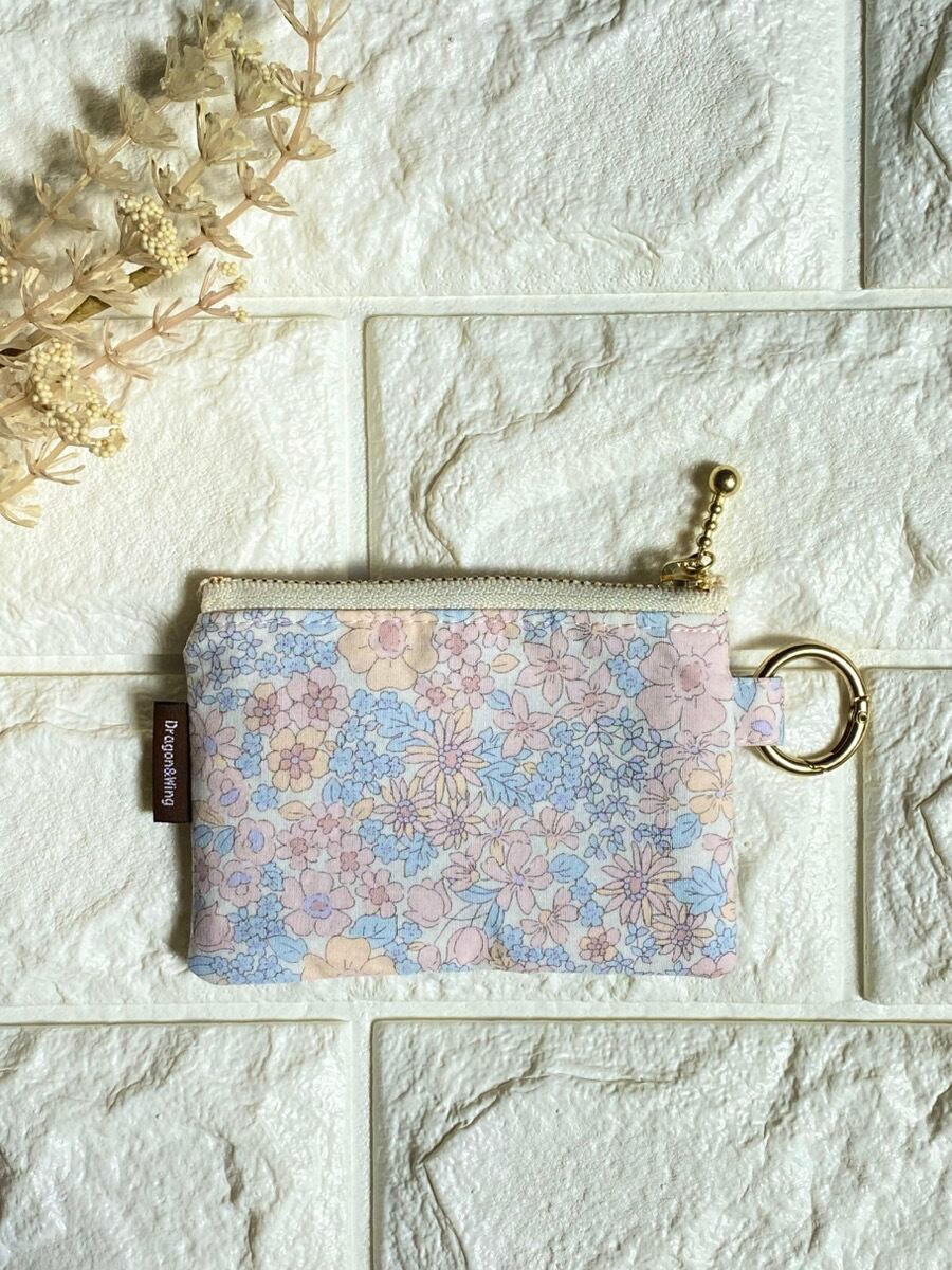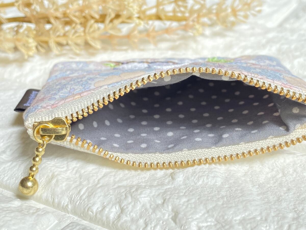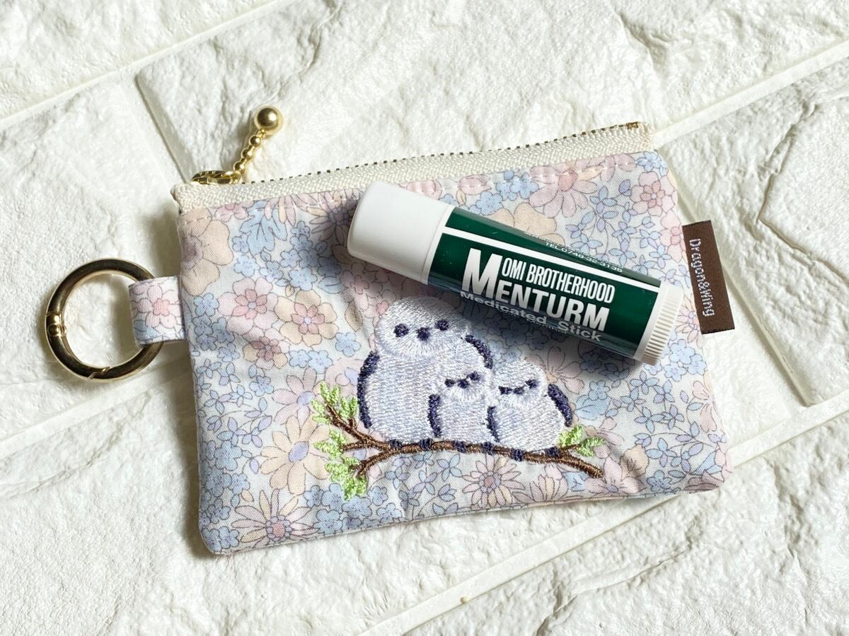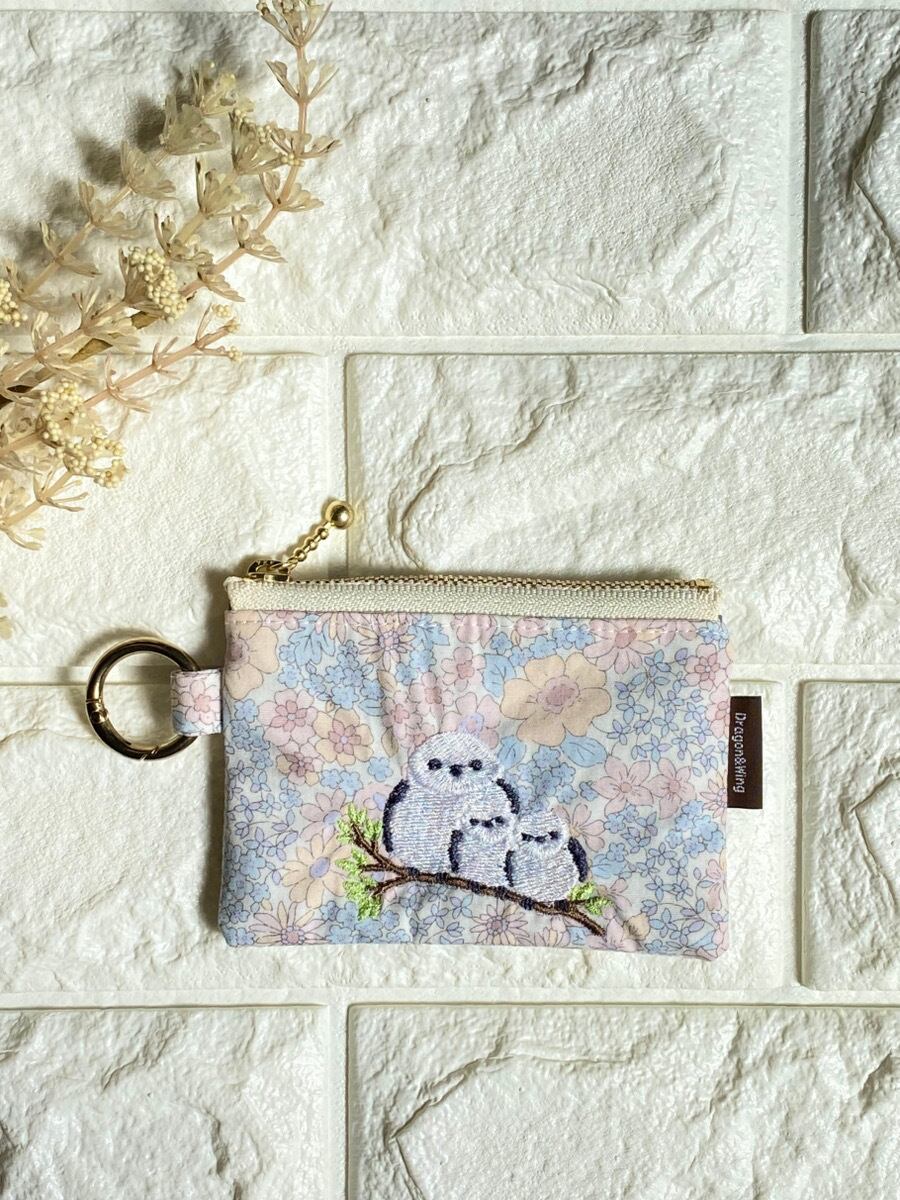 カラビナ付きシマエナガ刺繍ミニポーチ|キーケース・イヤホンケース・小銭入れ|フラワーパステル
