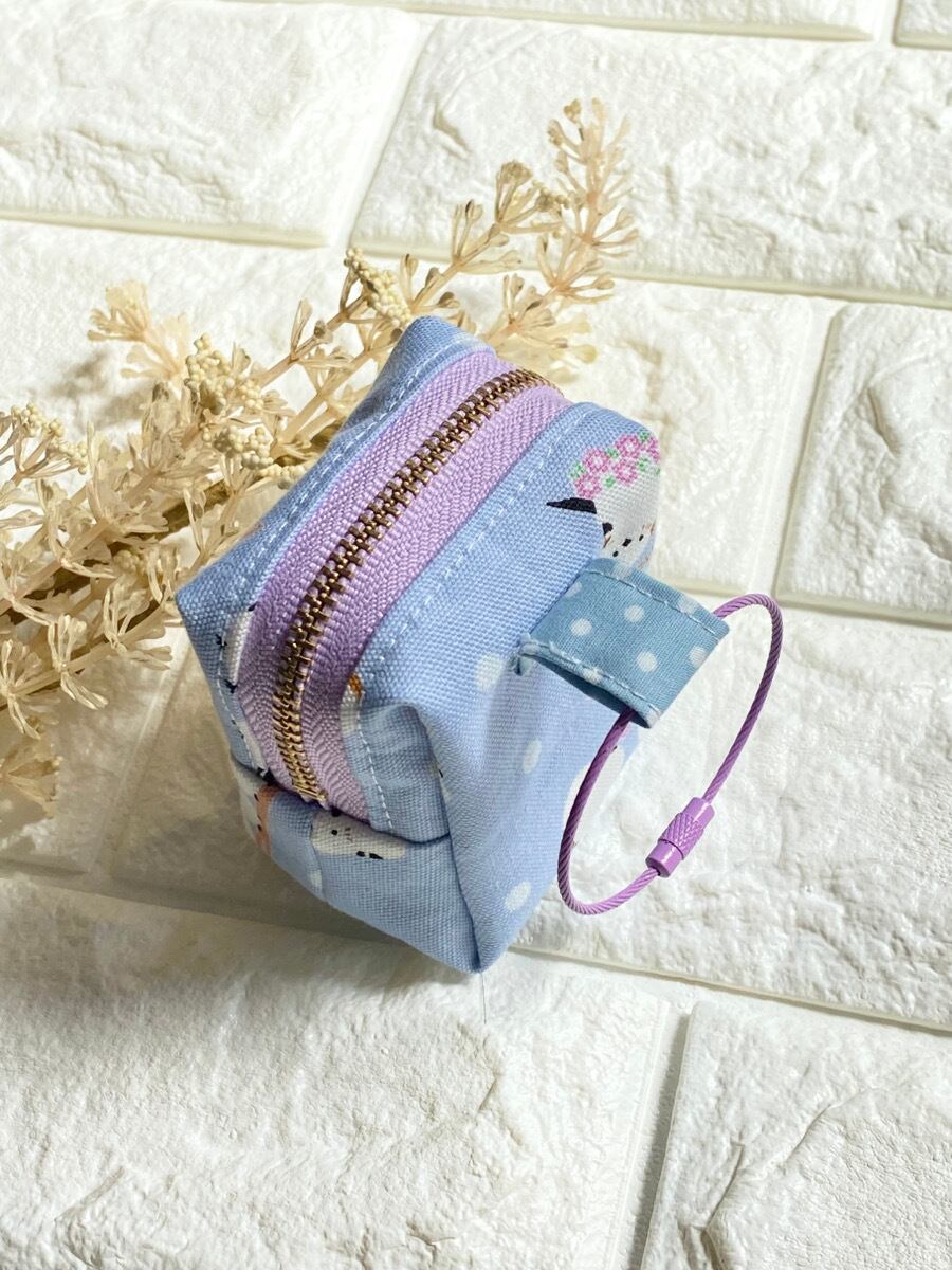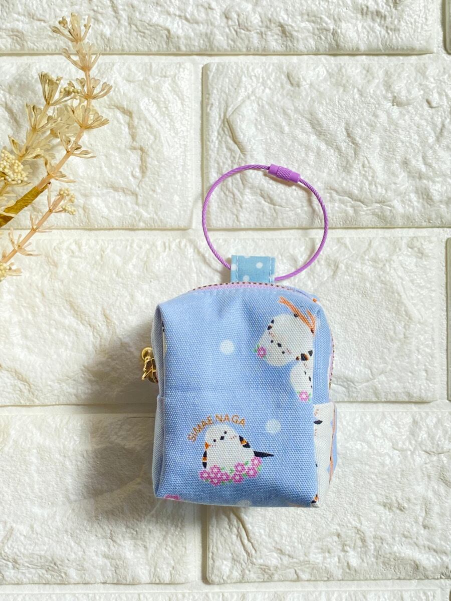 カラビナ付きシマエナガミニポーチ|リップケース・イヤホンケース・小銭入れ|くすみブルー