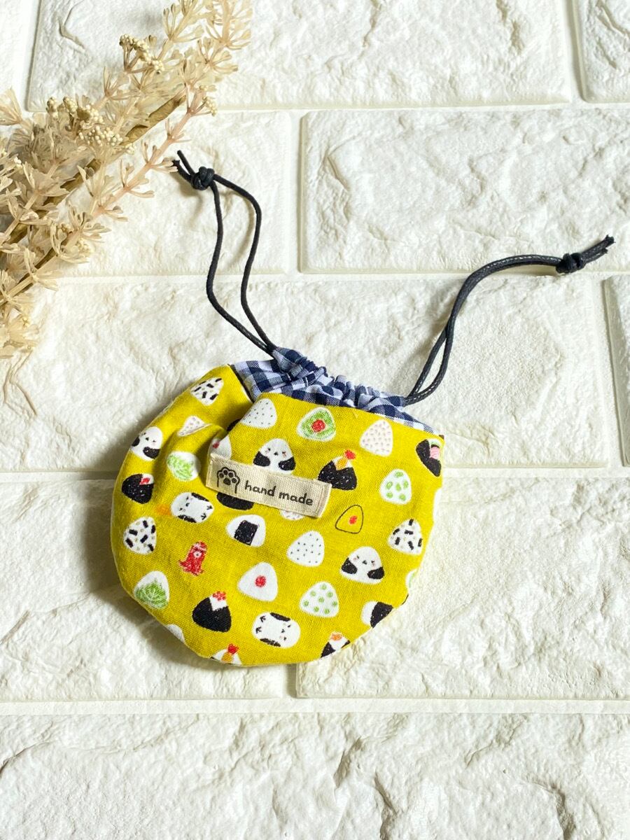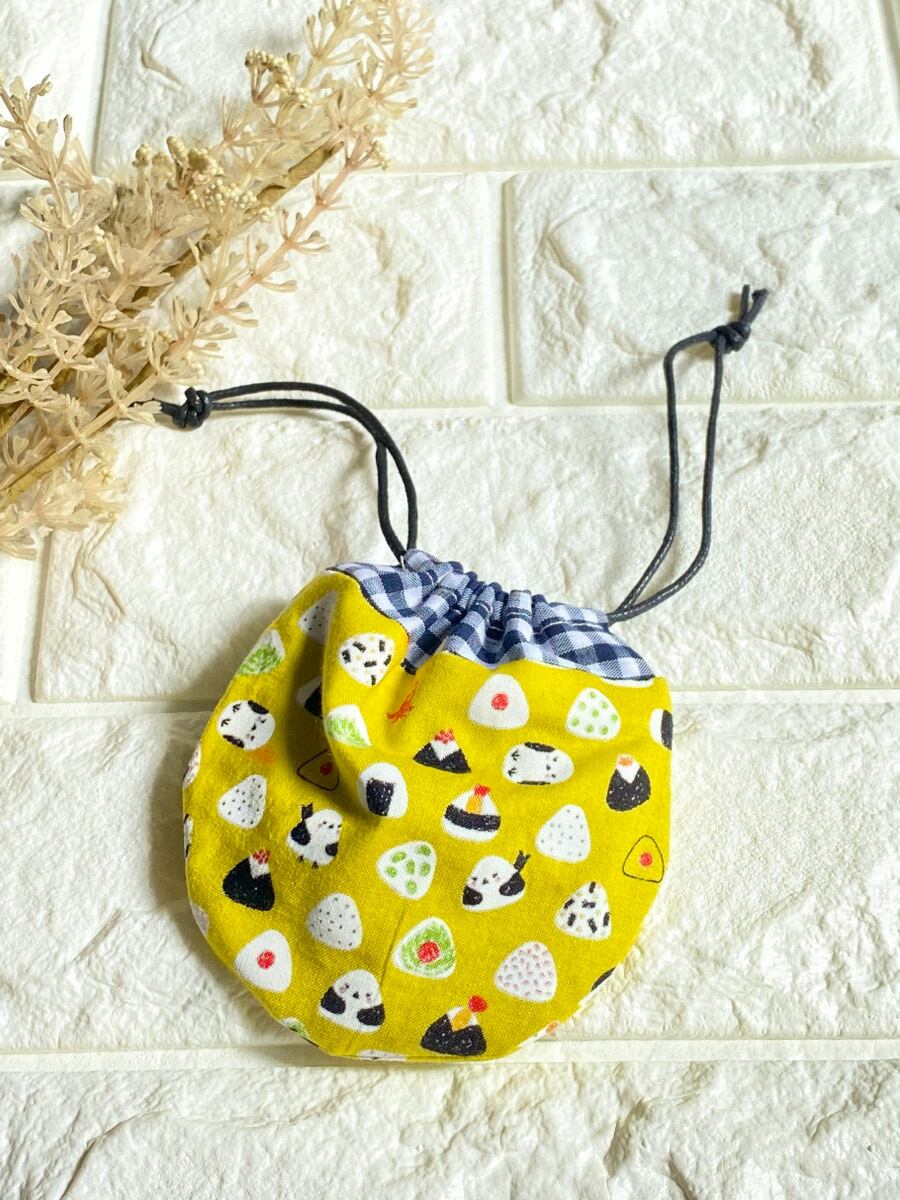 シマエナガおにぎり柄ミニミニ巾着ポーチ|リップケース・イヤホンケース・小物入れ|イエロー
